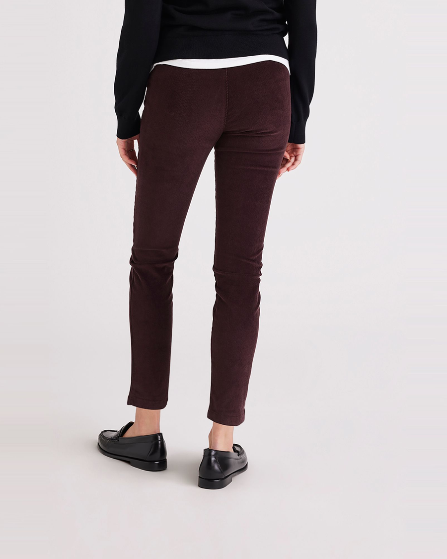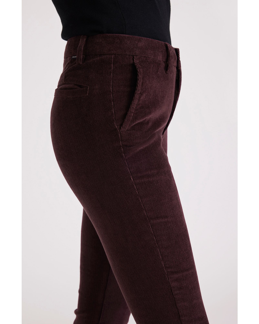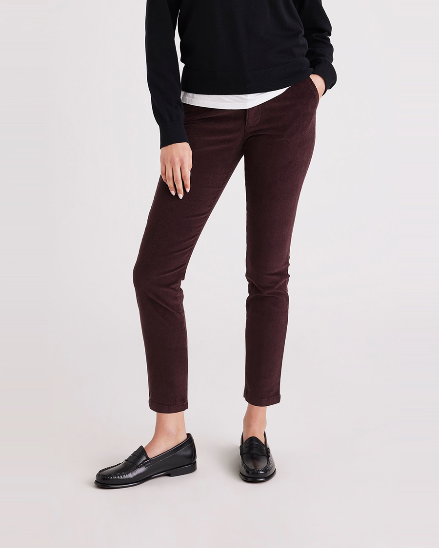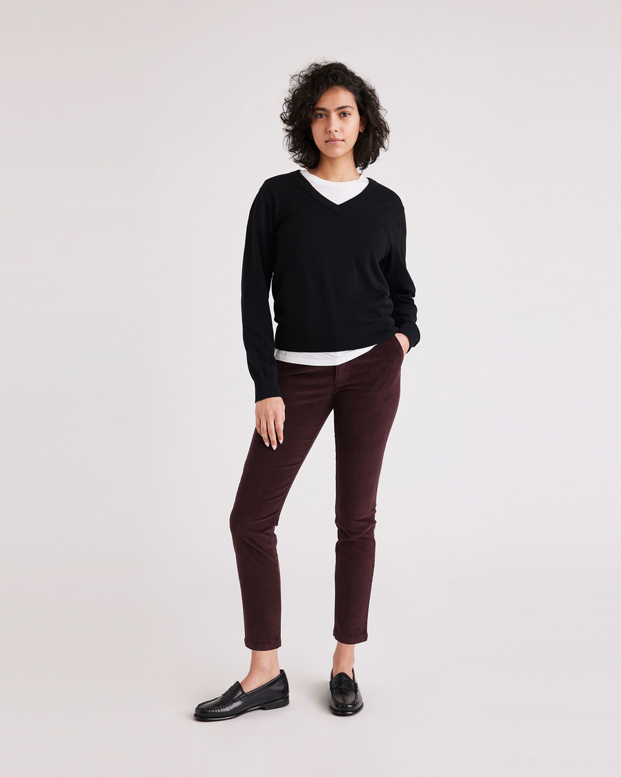 - A mid-rise fit with a skinny leg opening
