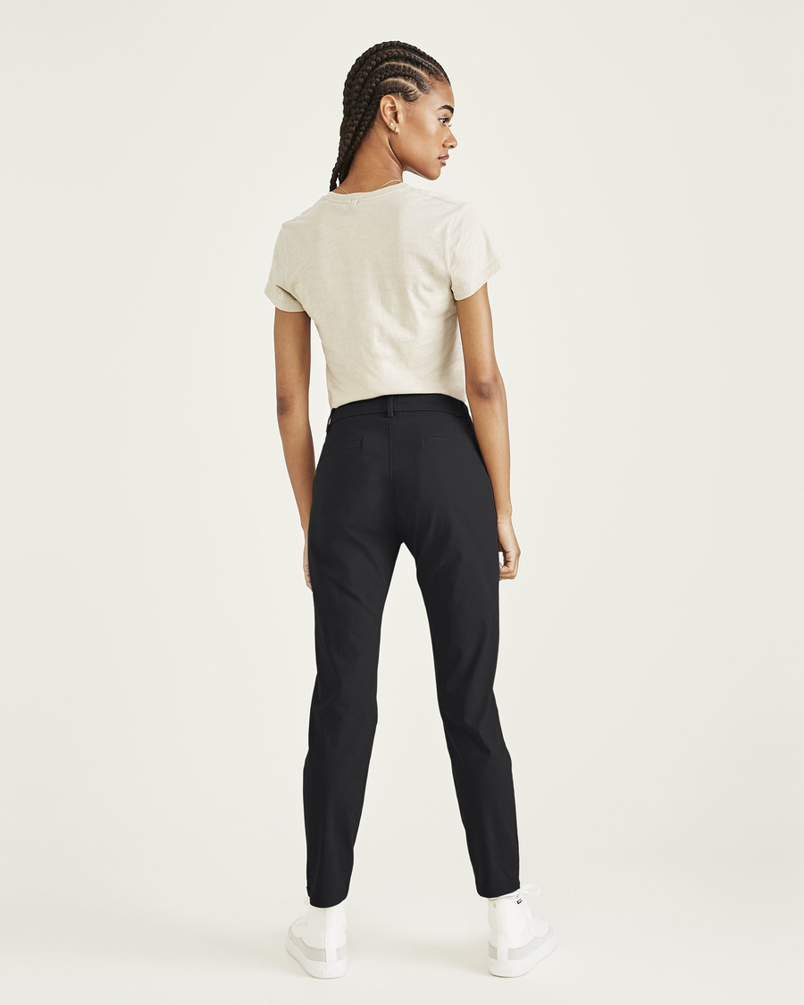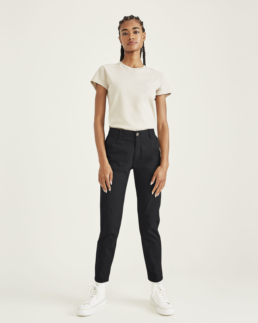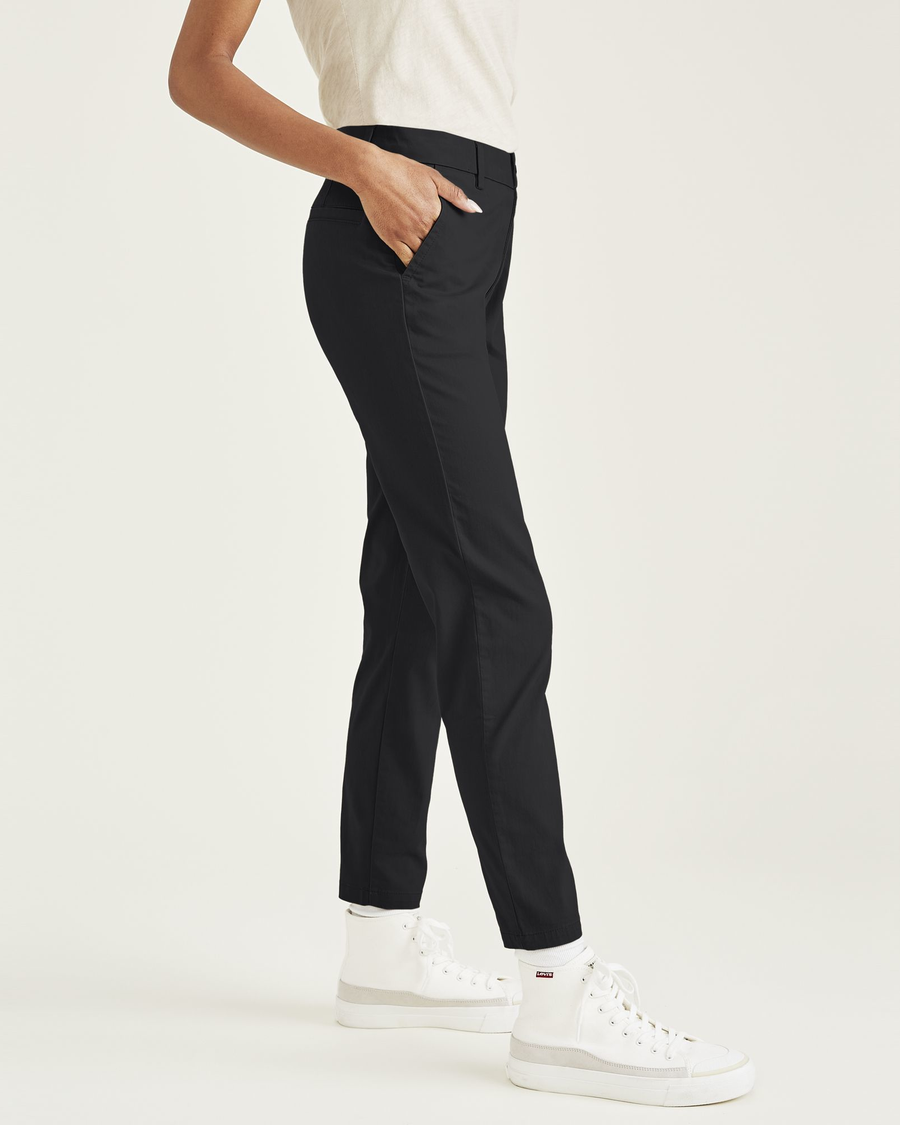 - A mid-rise fit with a skinny leg opening
